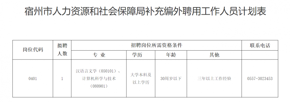 根据工作需要,宿州市人力资源和社会保障局面向社会补充招聘编外聘用工作人员,现就有关事项公告如下: