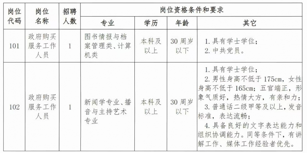 因工作发展需要,合肥市档案馆2025年公开招聘政府购买服务岗位人员2名,现就有关事项公告如下: 一、招聘原则 坚持“公开、公平、竞争、择优”的原则。 二、招聘岗位及条件 三、招聘条件 (一)招聘对象除满足上述招聘岗位表中条件外,同时须符合以下条件: 1.政治立场坚定,能认真贯彻执行党的方针、政策,有组织观念和大局意识;能坚持原则,秉公办事,团结协作,作风正派,廉洁自律; 2.有一定的组织协调能力,具备岗位所需要的相关知识和工作经验,能积极主动工作; 3.身体健康,无违法违纪行为; 4.具备招聘岗位要求条件。 (二)“年龄要求”中的“30周岁以下”为“1994年12月24日及以后出生”(其他涉及年龄计算的以此类推)。 (三)报考人员所学专业以毕业证书专业为准,不可以凭专业(学业)证书、结业证书、辅修证书、毕业证书上的辅修专业报考。毕业证书上专业后面带括号,只能代表所学内容有所涉及,不能认定为专业(教育部公布的“专业指导目录”中自带括号的除外),只能以括号以外的专业名称报考相符合的岗位。香港、澳门大学学历,须经国家教育行政主管部门认可;国外学历,需要经国家教育部相关部门学历认证;上述人员同时须符合公告规定及岗位要求的报考资格条件。 (四)有下列情形之一的人员,不得报考: 1.不符合招聘岗位条件要求的人员; 2.在读的全日制普通高校学生; 3.现役军人; 4.经政府人力资源和社会保障部门认定具有考试违纪行为且在停考期内的人员; 5.曾因犯罪受过刑事处罚的人员和曾被开除公职的人员、受到党纪政务处分期限未满或者正在接受纪律审查的人员、处于刑事处罚期间或者正在接受司法调查尚未作出结论的人员; 6.被依法列为失信联合惩戒对象的; 7.不符合招聘岗位所要求的相关资格条件; 8.法律规定不得参加报考或聘用的其他情形人员。 四、招聘程序 公开招聘工作按照网上报名与资格初审、笔试、资格复审、面试、体检与考察、公示和聘用等步骤进行。 (一)网上报名与资格初审 1.报考人员登录人事考试网上服务平台(https://www.exapt.cn/)进行报名。统一报名时间为2025年12月24日9:00至12月28日16:00,逾期不再报名。报考人员限报一个岗位,并必须使用同一有效居民身份证报名和参加考试。所提交的报考信息应当真实、准确。资格审查贯穿整个招聘及聘用过程,凡因弄虚作假或虽通过资格审查但实际与报考条件规定不符的、考察不满足条件的,一经查实,即取消考试及聘用资格。对伪造、变造有关证件、材料、信息,骗取考试或应聘资格的,将按有关规定给予严肃处理。 2.报考人员必须于12月29日16:00前登录人事考试网上服务平台(https://www.exapt.cn/)查询是否通过资格初审。通过资格初审的报考人员须于12月30日16:00前通过人事考试网上服务平台(https://www.exapt.cn/)缴纳考试费用,逾期视为自动放弃报考。 3.报名结束后,招聘岗位缴费人数与招聘计划数的比例达到3:1方可开考,未达到以上开考比例的,则取消该岗位招聘。因比例不足而被取消岗位的已缴费报考人员可在报名工作结束后退回所缴纳考试费用,其他情形所缴考试费用不作退回。 4.初审通过且缴费的报考人员可于2026年1月8日9:00起在人事考试网上服务平台(https://www.exapt.cn/)自行下载并打印笔试准考证。 5.本次招聘资格复审等环节时间另行公告通知,请报考人员密切关注人事考试网上服务平台(https://www.exapt.cn/)公布的相关信息。因自身原因导致错过各环节通知的,视为主动放弃。 (二)笔试 通过资格初审且成功缴费的人员进入笔试环节。 1.笔试时间为2026年1月10日,笔试地点等事宜以《笔试准考证》登载信息为准。 2.笔试科目为《综合知识》,内容包括政治、经济、法律、人文、历史、计算机基础、公文处理、档案业务知识等相关内容,总分为100分(成绩精确到小数点后两位,第三位四舍五入)。笔试采取闭卷 形式进行,不指定参考资料。笔试成绩设定最低分数线60分,未达到最低分数线的考生不得进入下一环节。 3.笔试结束10个工作日内,在人事考试网上服务平台(https://www.exapt.cn/)公布笔试成绩,按招聘岗位计划数,依据笔试成绩(保留到小数点后两位,第三位四舍五入)从高分到低分,按岗位招聘计划数1:5的比例,确定入围面试人员名单;不足规定比例的按实际人数确定。最后一名如有多名考生笔试成绩相同的,一并进入面试环节。 (三)资格复审 1.面试入围人员面试前应进行现场资格复审。被确定为进入资格复审的人员,须在规定时间内携带以下材料到指定地点进行资格复审: (1)本人有效居民身份证原件及复印件1份; (2)毕业证、学位证原件及复印件1份;持香港、澳门大学学历证书的人员,须提供国家教育行政主管部门认可的证明;持国外学历证书的人员,须提供国家教育部相关部门学历认证证书;(3)人事考试网上服务平台(https://www.exapt.cn/)打印的报名表1份; (4)“中国高等教育学生信息网(www.chsi.com.cn)”打印的《教育部学历证书电子注册备案表》及《中国高等教育学位在线验证报告》各1份; (5)属机关、事业单位在编正式工作人员的,须按干部人事管理权限提供单位和主管部门同意报考的证明原件1份; (6)自出生日期起不中断,截止时间在规定日期后的个人无犯罪记录证明材料1份; (7)招聘岗位规定要求的相关证书原件及复印件1份;101岗位需提供党组织关系证明原件1份。 2.凡出现