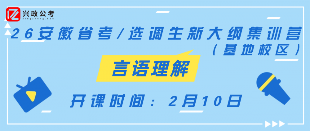 备战26安徽省考、选调生笔试,言语理解还在因主旨判断偏、逻辑填空错、语句表达乱频频失分?中心主旨抓不准、选词填空凭语感、语句排序理不清?双考模式下,言语理解板块正确率忽高忽低,成了提分路上的“拦路虎”?2月10日,兴政公考言语理解专项集训营(基地校区)重磅开课,带你精准适配双考命题规律,一举突破言语理解备考瓶颈!